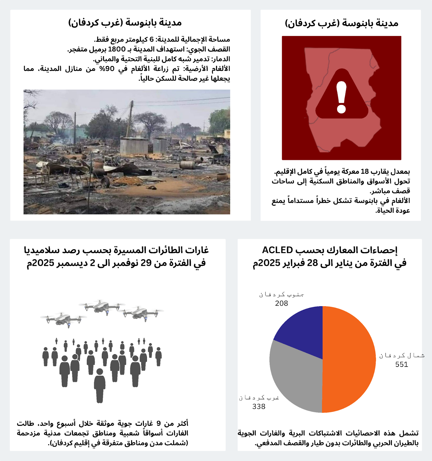 يسلط هذا التقرير الضوء على الأهمية الاستراتيجية لإقليم كردفان التي جعلته أرضاً للمعارك بين الطرفين وساحةً لغاراتهما الجوية والانتهاكات ضد المدنيين. كما يكشف عن حجم الكارثة الإنسانية المتفاقمة التي تواجه مئات الآلاف من السكان المحاصرين والمشردين في ظل صعوبة الوصول إليهم.