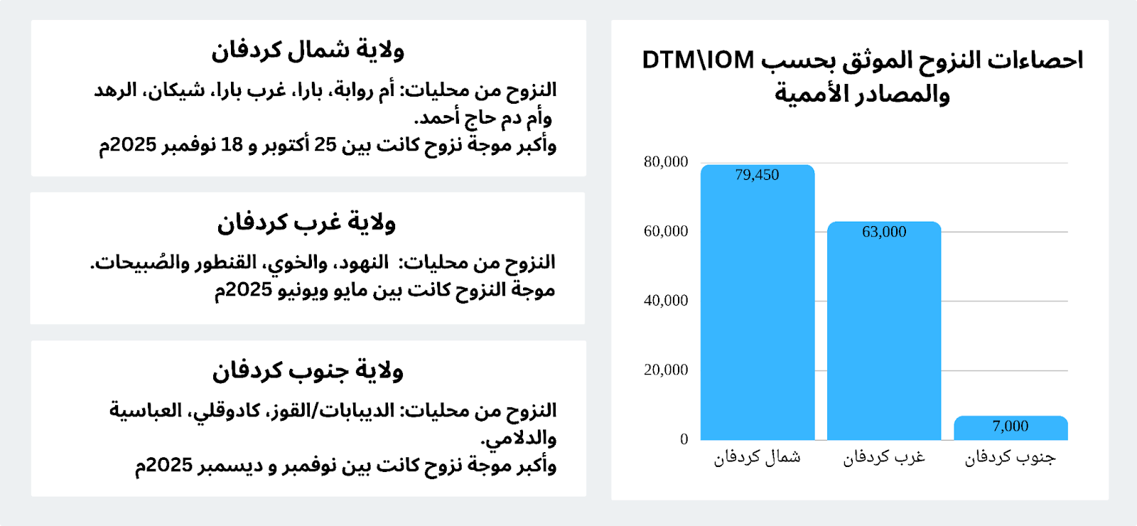 أجبر القتال في مدن كردفان آلاف المدنيين على النزوح، وتحدث نازحون لسلاميديا عن اضطرارهم للسير مسافات طويلة عبر طرق محفوفة بالمخاطر، في ظل غياب وسائل النقل وارتفاع تكلفة الترحيل. وأشارت تقارير بعض المنظمات الاممية الى نزوح ما يقدَّر بـ 213 ألف شخصاً خلال العام 2025م، بسبب اشتداد القتال وانعدام الأمن والغذاء في اقليم كردفان.